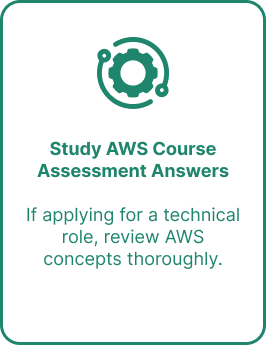 For technical positions, including AWS Solutions Architect, Technical Account Manager (TAM), and Support Engineer roles, the assessment will ask you to provide AWS course assessment answers to technical knowledge tests. These cover: