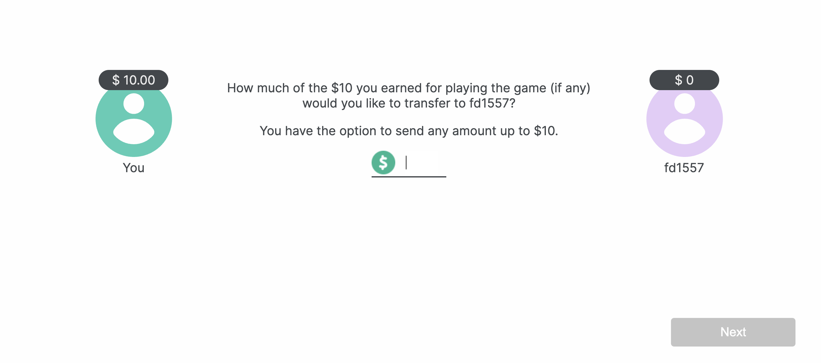 For the first Pymetrics money game, you need to decide how much money you want to transfer to the other player according to the trust you put in him. By transferring a large amount of money, you show you trust the other player to be fair and return to you some of the money he gained. By transferring a small amount, you display suspicion toward the other player.